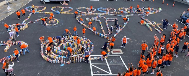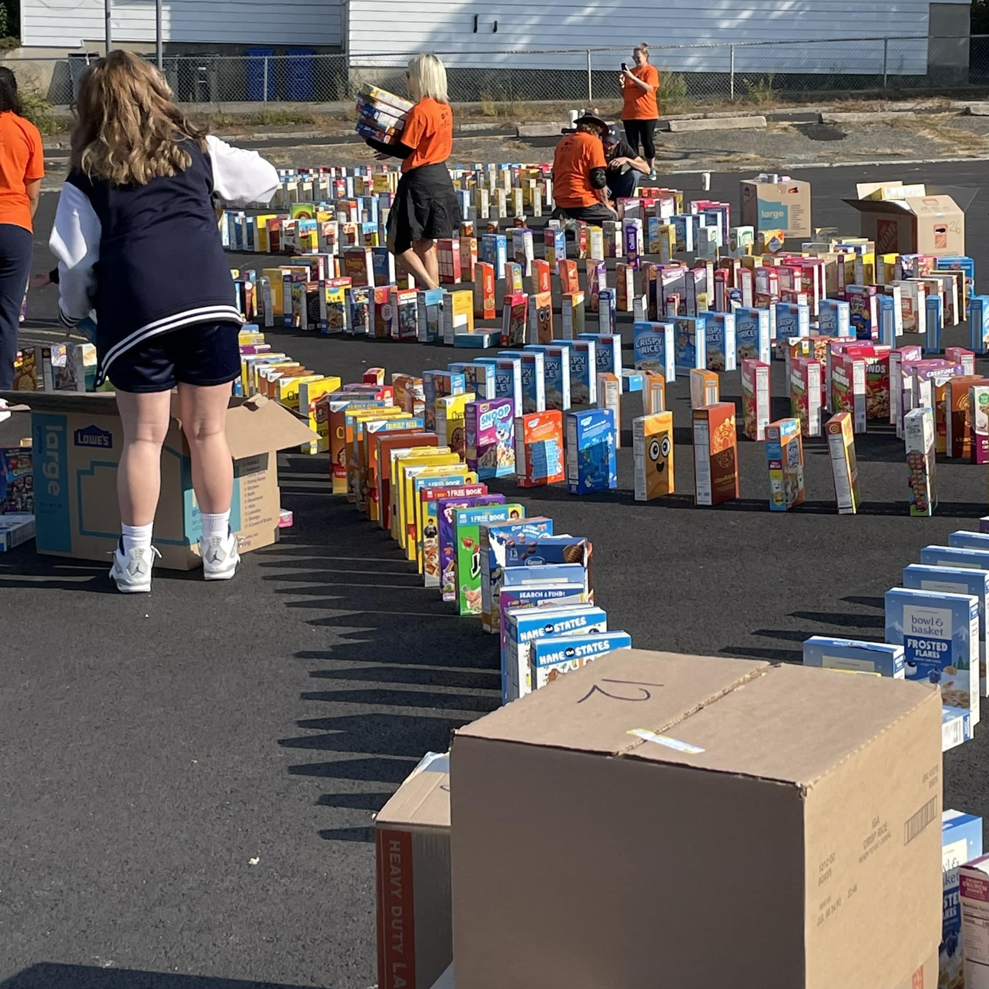 But first, all those boxes were used in the creation of a “cereal domino” to the enjoyment of all. Boxes were set standing up in continuous rows of interconnected circles, swirls and hearts throughout the parking lot. At the appointed time, the first box was knocked over and then all watched as the “dominoes” fell – with a little help from volunteers. A drone above and video cameras on the ground caught the action.